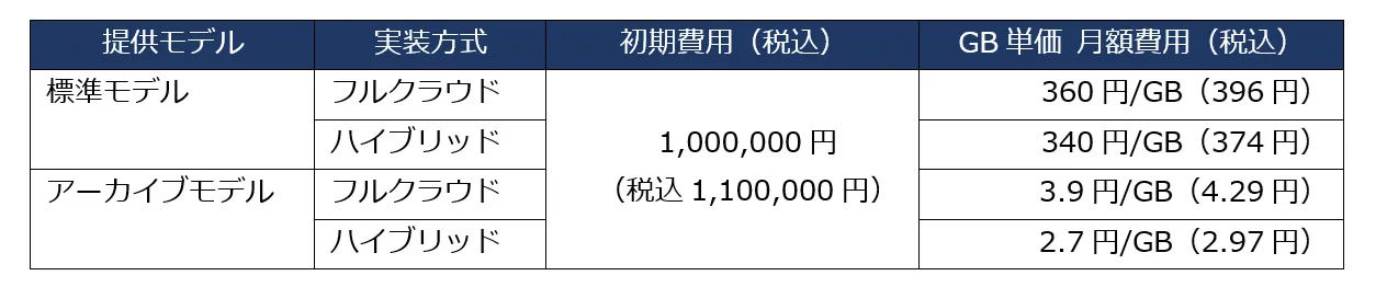 ストレージ種別としてオンライン処理に適した標準モデルとバックアップに適したアーカイブモデルをご用意しています。実装方式として、運用作業が不要で面倒なシステム運用を行わずに済むフルクラウド方式(分散保存先の3環境をすべてサービス側で提供)とお客さまの環境を一部活用するハイブリッド方式(分散保存先の2環境をサービス側、1環境をお客さまの環境で提供)をご用意しています。