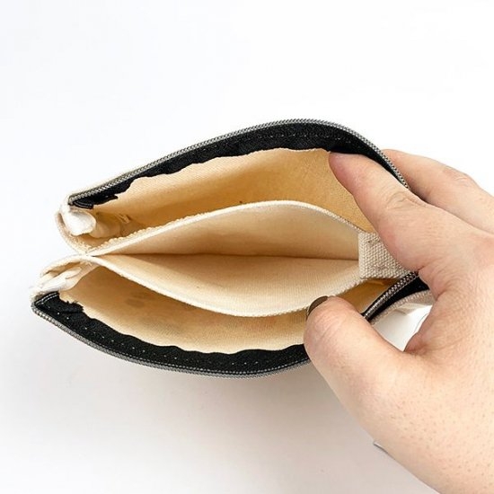 ファスナーを開くと、3つのポケットが現れます。それぞれにフラットなポケットなので、かさばらないのも魅力の一つです。