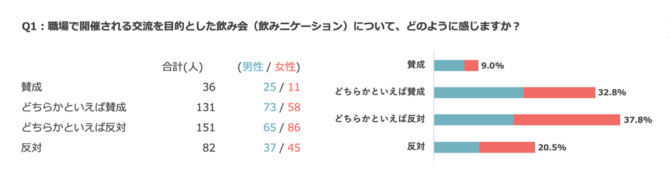 職場での「飲みニケーション」に対する意識を調査したところ、賛成派が41.8%、反対派が58.3%という結果になりました。また、回答の内訳を見ると「賛成」と答えた人は9%、「反対」と答えた人は20.5%で、明確に「反対」と答えた人が「賛成」と答えた人の約2.3倍に上ることがわかりました。さらに性別での傾向を分析すると、男性は賛成派と反対派がほぼ均一でしたが、女性は反対派が賛成派の約1.9倍と、反対意見がやや強い傾向が見られました(Q1)。