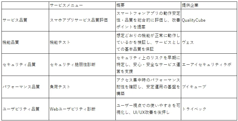 「サービス品質」「機能品質」「セキュリティ品質」「パフォーマンス品質」「ユーザビリティ品質」それぞれにプロフェッショナルなサービスを展開する各社の、それぞれの強みを活かした「品質支援サービス」として以下の5つの診断・評価サービスを提供します。