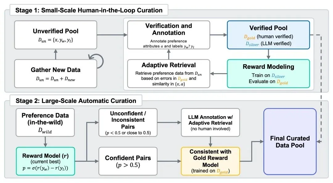 この機構により、チームは元の4000万サンプルから2600万条の精選データのスクリーニングに成功し、人工アノテーション負担を大幅に削減すると同時に、選好データの規模と品質間の良好なバランスを実現しました。