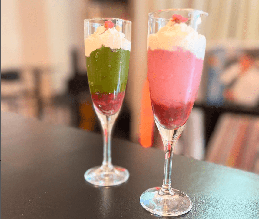 〈下層:あんこ〉〈中層:ぷるぷるのわらび餅〉〈上層:ふんわりホイップ〉という三層構造で、食感と甘さのバランスにこだわったパフェは、見た目も楽しめる一品です。