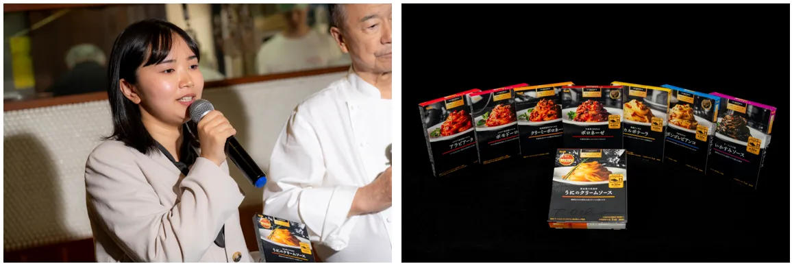 はじめに、MCからブランドと新商品の紹介がありました。続いて、落合務シェフとエスビー食品マーケティング企画室 風間美柚が登壇。ラ・ベットラの看板メニュー「うにのクリームソース」を開発した時のことについて、落合シェフは「うにのクリームソースパスタはイタリアにはないんです。1977年にイタリアへ行き、料理の勉強をしたのですが、最終的にはうにのパスタは一度しか食べていない。イタリアはあまりうにを食べる習慣がないのです。帰国後、僕にお店を出させてくれた社長がいて、彼は和食の店をやっていました。彼から、和食食材のうにを使ったパスタはないのかと聞かれ、イタリアで食べたものを試しに作って出してみたんです。すると『おいしくない』と言われてしまい、それが悔しくて。そのとき作ったパスタのうにが、まるで“焼きたらこ”のような食感で、たしかにあまりおいしくなかった。それでベースのソースをイチから開発し、いまのメニューができあがりました」と語りました。落合シェフこだわりの一品をレトルトで再現するにあたり、風間は「商品自体が落合シェフの代表作ですから、失敗はできないですよね。シェフに細かくアドバイスをいただきながら作っていました。ご病気をされて休まれていたときもお電話をいただいて、試作品をお送りし、密にコミュニケーションをとり、長い時間をかけて商品化に至りました」とコメント。また、当商品のパッケージには、『ラ・ベットラ人気No.1メニュー』のアイコンを印字。そのパッケージについては、落合シェフも「24年前の発売当初のパッケージからどんどんセンスがよくなっていて、エスビーさんは素晴らしいです」と語りました。