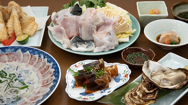 ふぐ鍋はもちろん、お刺身、唐揚げ、特大ヒレ酒など、ふぐを存分に味わえるメニューの数々が用意されています。