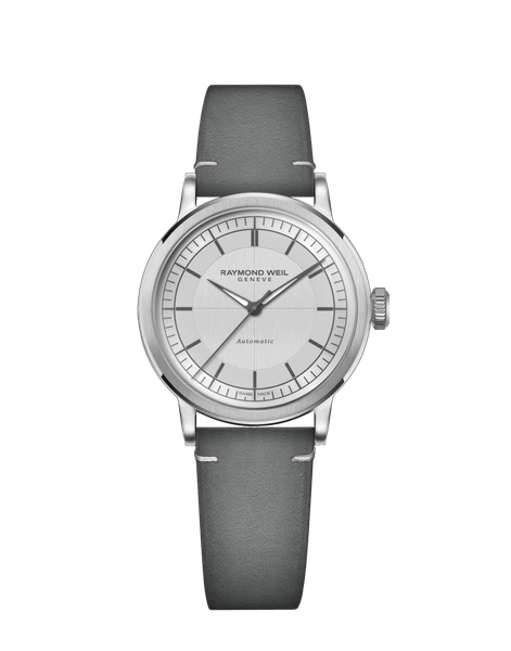 カーフレザーストラップは柔らかくさらさらとした手触りと、ヴィンテージ調の質感が特徴。剣先に、レイモンド ウェイルのイニシャルを象ったW 字型ステッチを刺繍しています。クラシカルな印象を強めるピンバックル仕様。