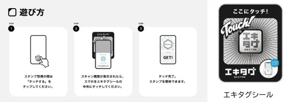駅などに設置された専用のNFCタグに、エキタグアプリをダウンロードしたスマートフォンをタッチすることで、設置された場所のスタンプをアプリ内のデジタルスタンプ帳で収集することができるアプリサービスです。