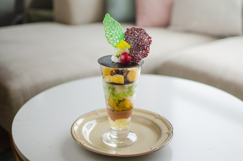 主役は、芳醇なカカオが香るチョコレートと、マンゴーやパッションフルーツの甘酸っぱさ、そして驚くほど爽やかな自家製「バジルのグラニテ」との意外なマリアージュ。食べ進めるごとに、パリパリのチョコディスクやフルーツの多彩な食感、グラニテのひんやりとした清涼感をお楽しみいただけます。チョコレートの上品な甘さとハーブが織りなす、まさに“大人のための贅沢”な新感覚パフェです。
