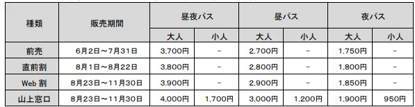 【料金】上記、夜パスまたは昼夜パスのとおり