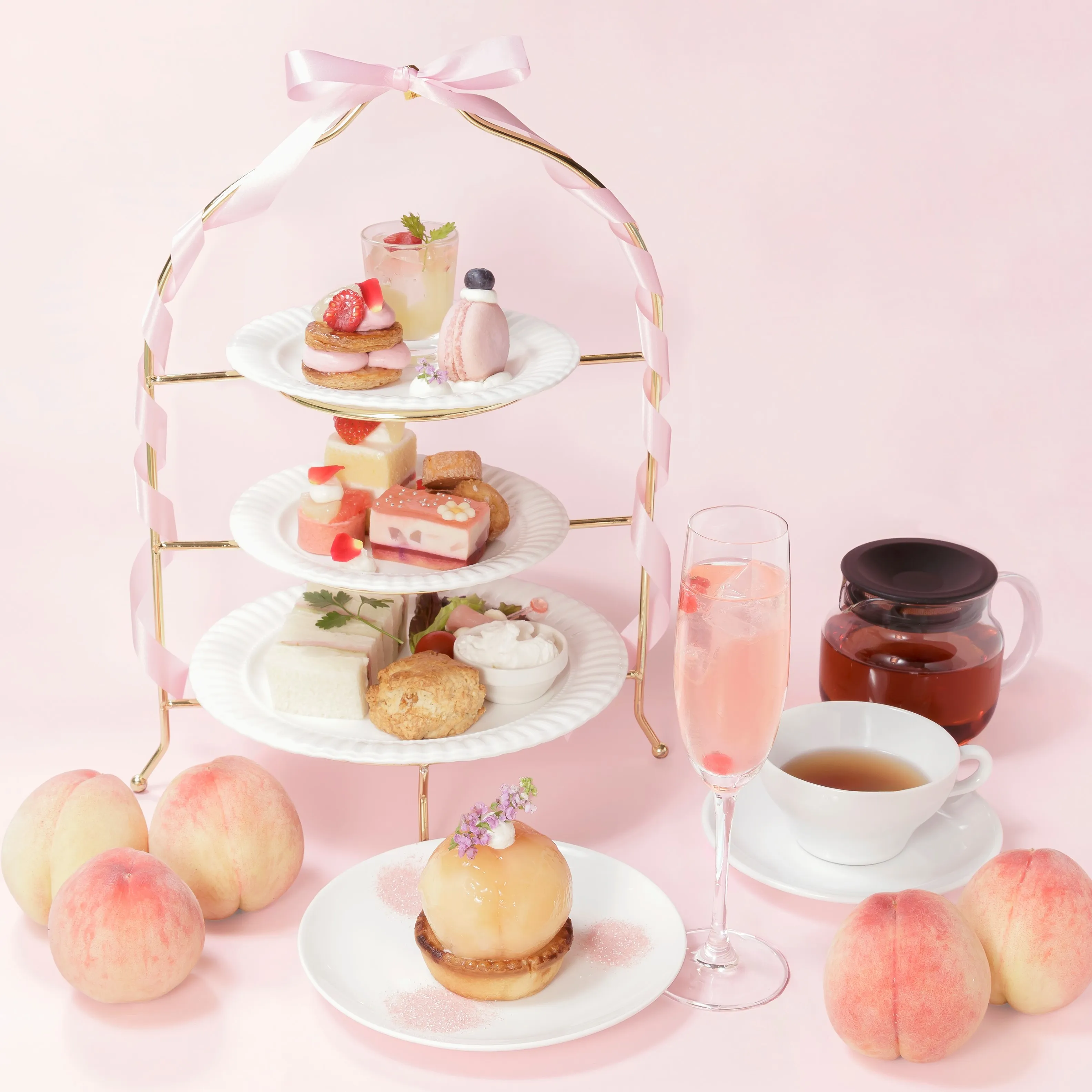 ソーダなど、旬の桃を堪能できるアフタヌーンティーセットです。