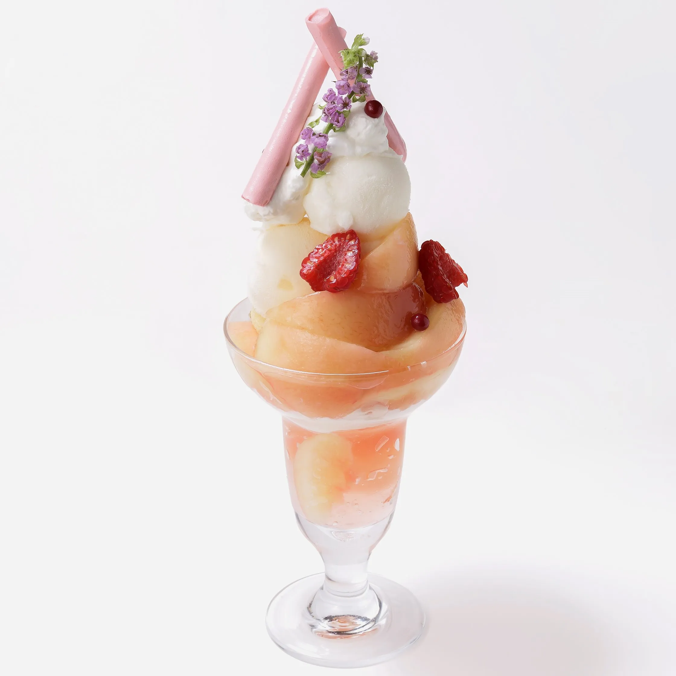桃と相性の良いヨーグルトを組み合わせたパフェ。ヨーグルトクリームとヨーグルトソルベ、桃ソルベ、桃ゼリーなどさっぱりとした味わいです。最後まで桃を一緒に食べれるように中にも桃がたっぷりと入っています。
