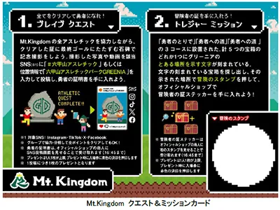 お城をモチーフにした複合型アスレチックやドラゴンの体内を駆け回るネットアスレチックなど、31ポイントの挑戦が待ち受けます。その他にもMt.Kingdomのエリア内にある宝箱を探し出し、中に書かれた場所でスタンプを押すことで「冒険の証ステッカー」を入手できるミッションイベントも開催します。