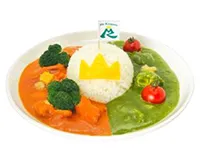 王冠マークのチーズが添えられたMt.Kingdomに伝わるトマトとほうれん草の秘伝の2種盛りカレー。