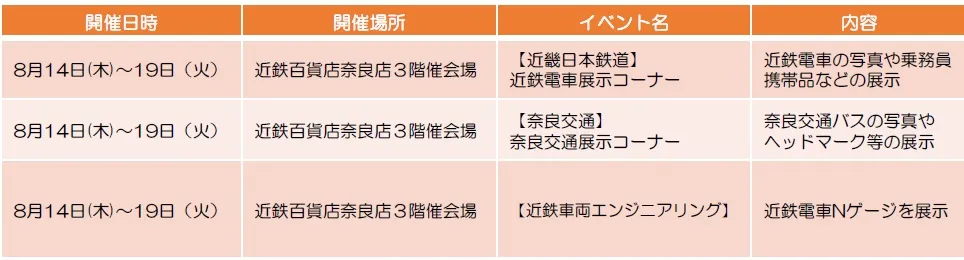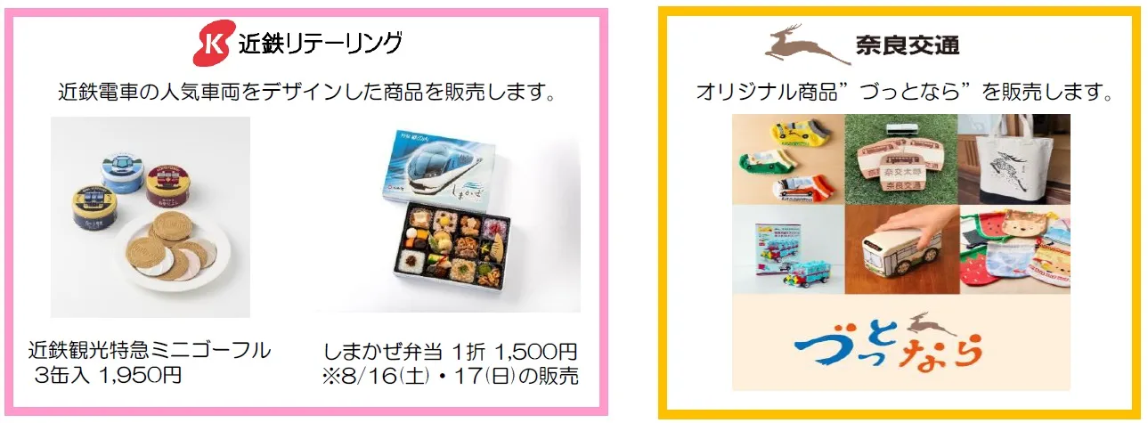 本イベントでは、近鉄グループ各社に関する食品やグッズの販売や、近鉄電車の乗務員が携帯している物品展示、奈良交通バスの写真やヘッドマークなど希少品の展示を行うほか、トークショーや特典付きクイズ大会を実施します。