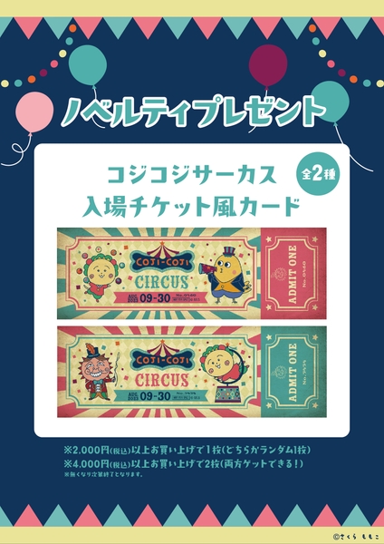 会計2,000 円(税込)以上ご購入ごとにランダムで1枚「コジコジサーカス入場チケット風カード」をプレゼントいたします。4,000 円以上(税込)ご購入で全2枚コンプリート。