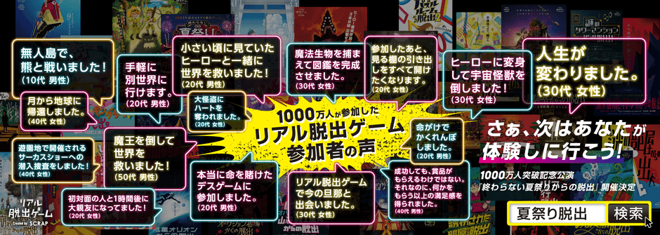 謎解きを通して参加者がまるで“物語の登場人物”になったかのような体験ができる「リアル脱出ゲーム」。2007年に初開催して以降、近年では年に40〜50のイベントを開催しており、累計の参加者数が1000万人を突破! それを記念して開催される2023年最大のリアル脱出ゲーム『終わらない夏祭りからの脱出』は、いよいよ今月末の開催となります。