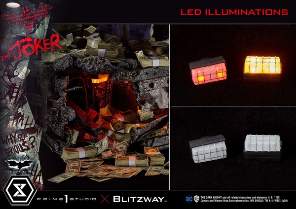 ・ベースは、劇中で大量のドル札を燃やしたシーンを彷彿とさせる、ガソリンタンクを配置。付属するドル紙幣は自由に配置可能。世界観をよりリアルに再現することが可能です。さらにLED発光ギミックを内蔵したライトも付属。ベース側面部には、永遠のライバル“バットマン”のシンボルマークもデザインされています。