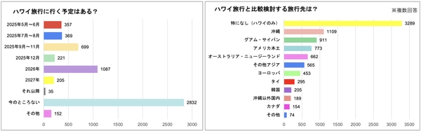 今後の渡航予定については、全体の過半数にあたる2,938人が2027年までにハワイを訪れる意向を示しており、2025年内が1,646人、2026年以降が1,327人でした。その他と回答した152人は、「もう少し円高になったら」や「お金がたまったら」など金銭的な要因を挙げました。比較検討している旅行先としては「特になし(ハワイしか考えない)」が最多で、次いで「沖縄」「グアム・サイパン」「米国本土」などが挙がり、ハワイの人気の高さがうかがえました。