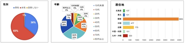 回答者の63%が女性。年齢構成は50代が33%、60代が28%、40代が17%で、40〜60代が大半を占めしました。居住地は関東が最多(3,953名)、次いで近畿(775名)、中部(477名)となり、都市部が中心でした。