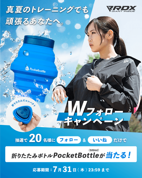 年々暑さが厳しくなっており、熱中症を発症する方も増え続けています。2025年6月1日から、労働安全衛生規則改正が施工され、事業者に対して熱中症対策が義務付けられるなど、熱中症対策は社会全体で重要視されています。そこで、「RDX® SPORTS」は猛暑の中トレーニングをする方の熱中症予防を目的に、折りたたみボトル「PocketBottle」が当たるサマーキャンペーンを開催します。「PocketBottle」はわずか3.5cmで500mlまで入るシリコンボトルになっており、あらゆるシーンで使用いただけるアイテムとなっております。
