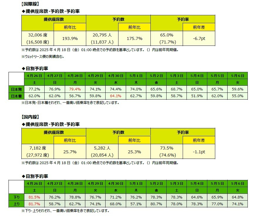 2025年4月18日 16:002025年度ゴールデンウィーク期間(2025年4月26日(土)~5月6日(火))のご予約状況を取りまとめましたので、ご報告します。