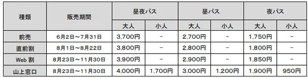 【料金】上記、夜パスまたは昼夜パスのとおり