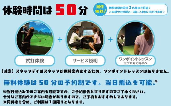 内容:試打体験+サービス説明+ワンポイントレッスン(プロ対応時のみ)