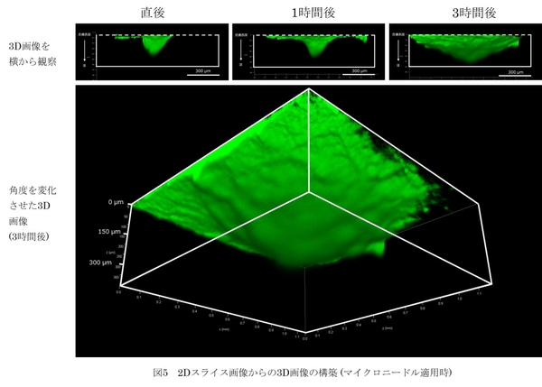 また、本研究ではヒアルロン酸Naマイクロニードルに内包した成分と同一の成分(ローダミンB)を溶解させた水溶液について、皮膚に塗布した際の経時的な3D皮内挙動を確認しました。