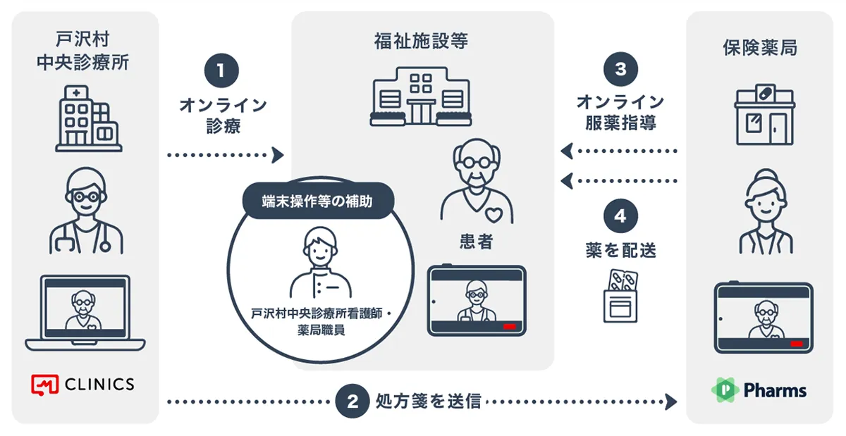 患者は福祉施設内の受診スペースにおいて、戸沢村中央診療所に勤務する看護師の補助を受けながら、受診用タブレットPCを通じて診療所にいるかかりつけの医師から「クラウド診療支援システム CLINICS」※1を用いたオンライン診療を受けます。処方薬については、処方箋を発行後、保険薬局に勤務する職員の補助を受けながらオンライン服薬指導を受けて配送で処方薬を受け取ります。これにより、医療機関は遠隔地からの診察や服薬指導が可能となるため、災害時の患者の受診機会の確保や医師の移動負担の軽減が実現され、持続的な医療提供体制の確保につながると考えます。