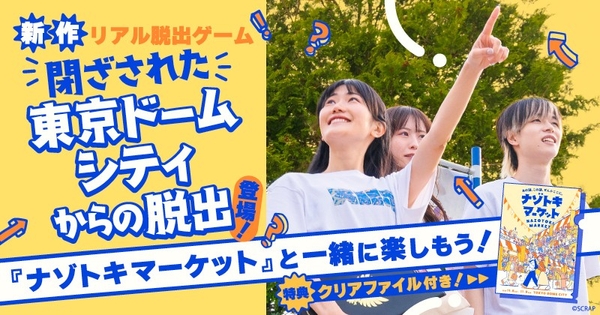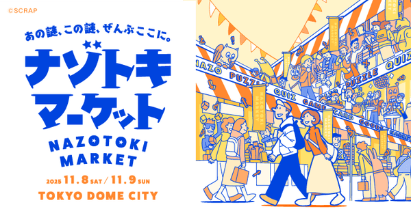 全世界で累計1,490万人以上を動員しているリアル脱出ゲームを企画制作する株式会社SCRAP(本社:東京都渋谷区、代表:加藤隆生)および株式会社東京ドーム(本社:東京都文京区、代表取締役社長 COO:長岡 勤)は、東京ドームシティ プリズムホールで2025年11月8日(土)、9日(日)に開催する謎解きグッズの祭典『ナゾトキマーケット』の出展ブース第1弾として、「SCRAP」をはじめ「トキキル」「よだかのレコード」「タンブルウィード」「街ハック!」「RIDDLER」を発表いたします。また『ナゾトキマーケット』の開催を記念して新作リアル脱出ゲーム『閉ざされた東京ドームシティからの脱出』を開催いたします。