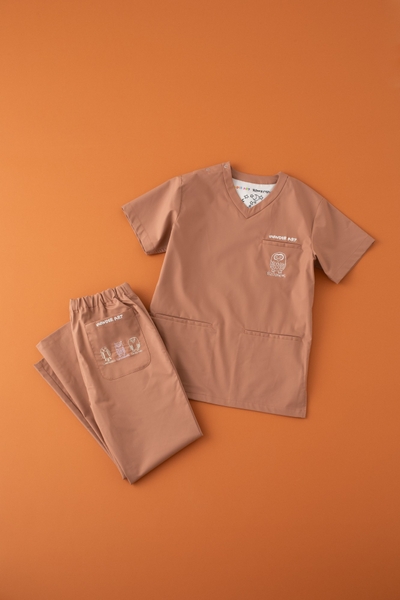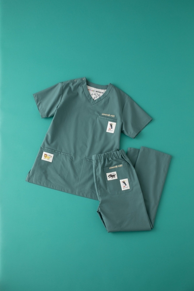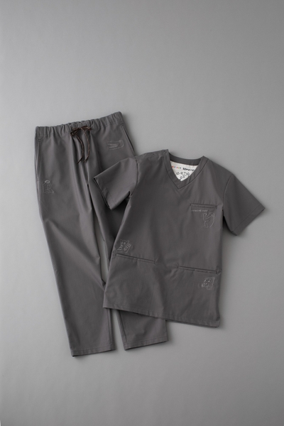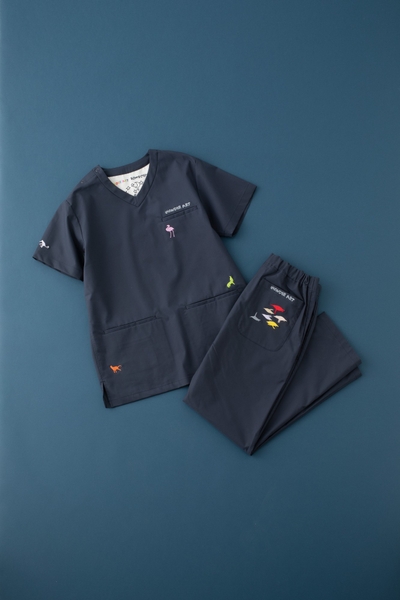 一見シンプルながら、よく見ると細やかに描かれた動物たちがスクラブのあちこちに潜んでいます。ふと目を凝らすと現れる彼らの表情やしぐさには、驚くほどの繊細さと豊かさがあり、着る人も見る人も惹き込まれる魅力があります。