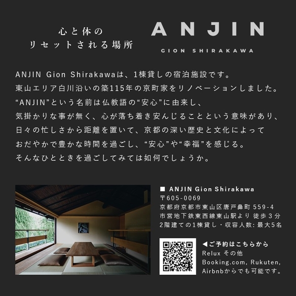 ANJIN Gion Shirakawaにおいては施設一棟を貸し切り、1日1組限定なので、コロナ禍でも安心して京都の旅を楽しめます。