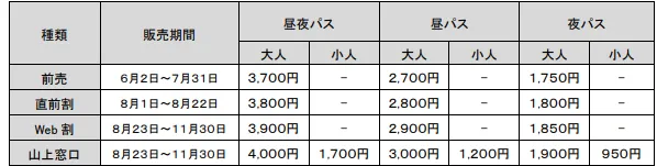 【料金】上記、夜パスまたは昼夜パスのとおり