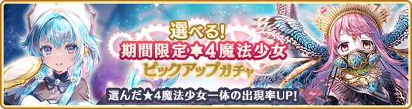 『選べる期間限定★4魔法少女 ピックアップガチャ』では、ピックアップ対象として、期間限定の★4魔法少女、またはレアガチャから登場する★4魔法少女から1体を選択できます。