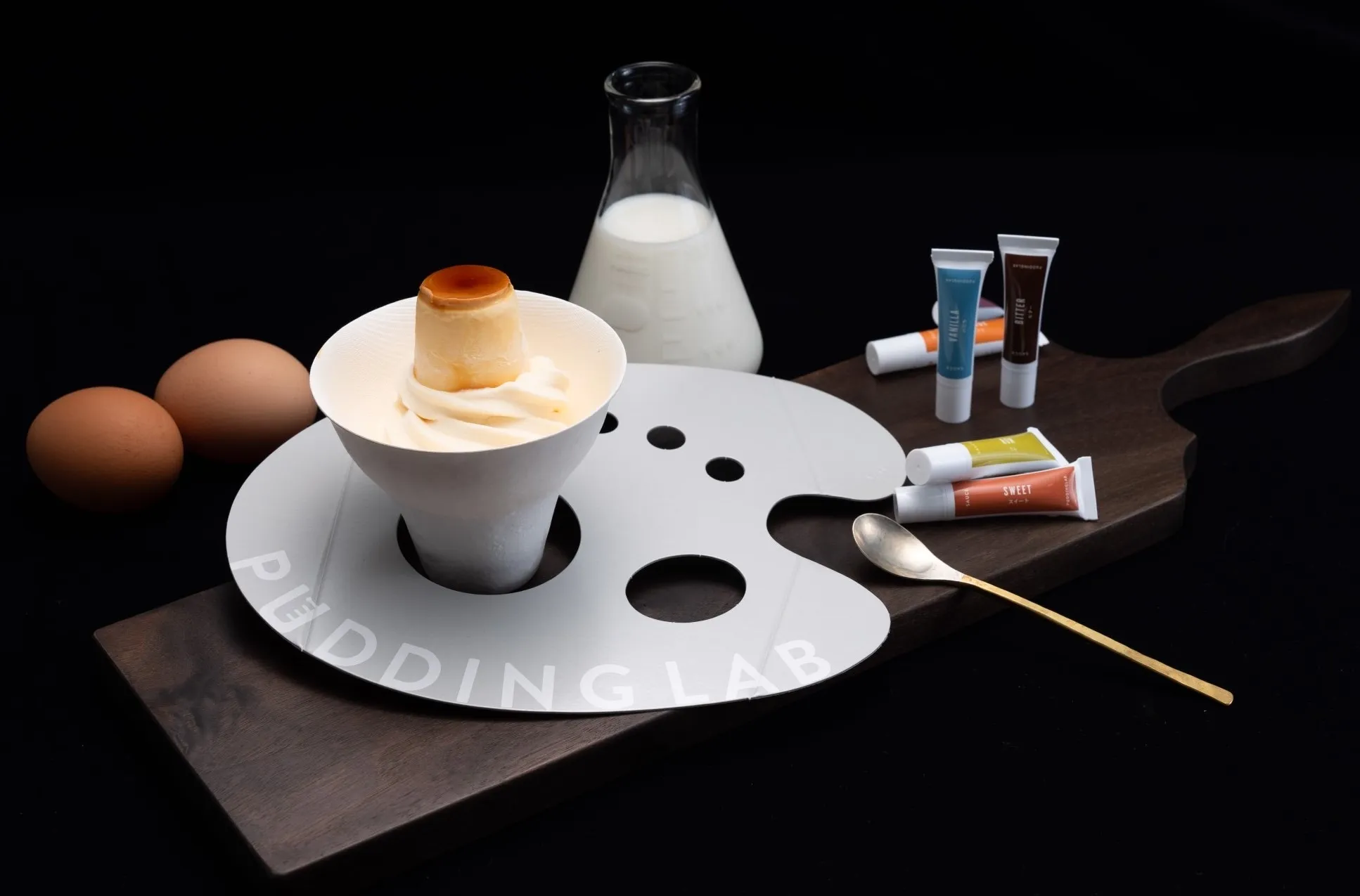 プリンそのものをソフトクリーム状にした-8℃のプリン。パレットのような遊び心のあるパッケージ。容器に入った2種類のソースで味変も楽しんでいただけます。