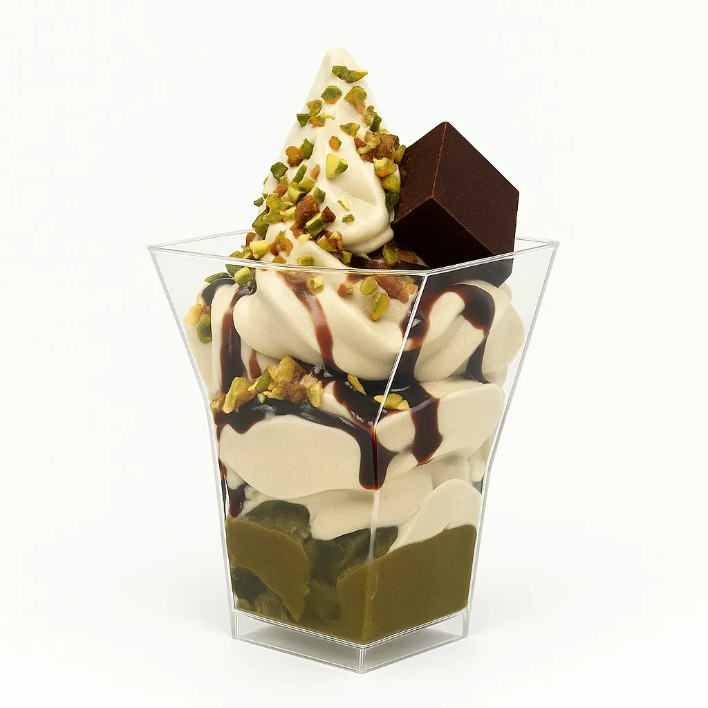 シチリア産ピスタチオを使ったソフトクリームにザクザク食感を生み出す「カダイフ」とチョコレートなどを合わせた贅沢なパフェです。