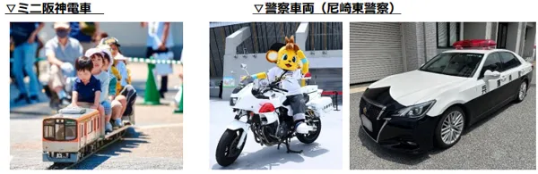 お子さまがさまざまなアトラクションで楽しめる「キッズエリア」を設置!「ミニ阪神電車」の乗車体験、お子さまに大人気の警察・消防車両と記念撮影が行える実車展示などの「はたらくくるま」コーナーや、地元「尼崎城」の巨大ふわふわなどで遊べる遊具コーナーを設置します!