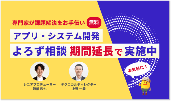現在開催中の、アプリ開発、システム開発の各分野の専門家による無料個別相談を、ご相談ニーズの多様化にお応えするため【2025年8月29日(金)】まで期間延長して実施いたします。
