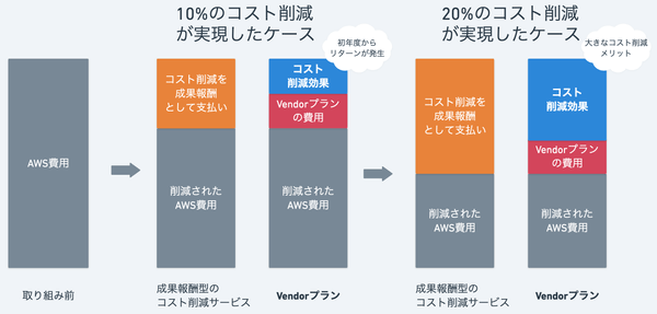 一般的なインフラサービスの場合、コスト削減サービスは成果報酬型です。初年度に削減できた費用は、全て報酬としてコスト削減サービスに支払うため、削減効果を実感できるのは契約の翌年からになります。一方、「Vendorプラン」は定額報酬型のため、コスト削減のリターンを初年度から受け取ることができ、また、削減額が大きいほどコスト削減効果は大きくなります。