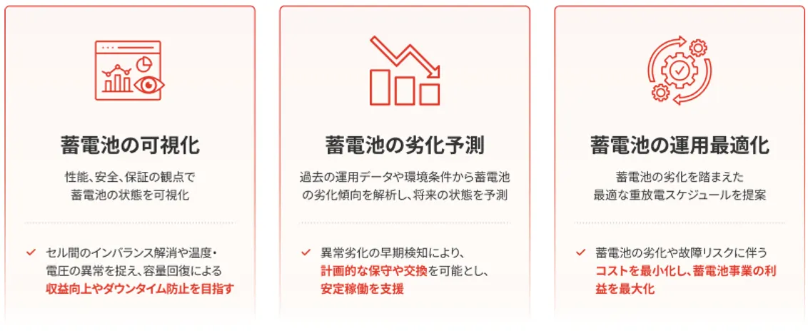 ・アプローチ:蓄電池の状態可視化、劣化予測、運用最適化