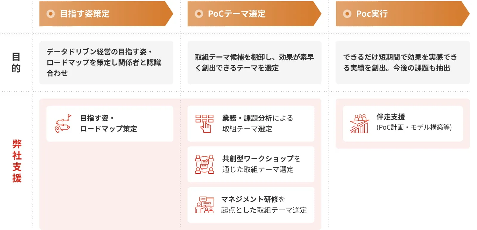 ・解決:目指す姿の策定からPoC実行まで、課題に応じてカスタマイズして支援