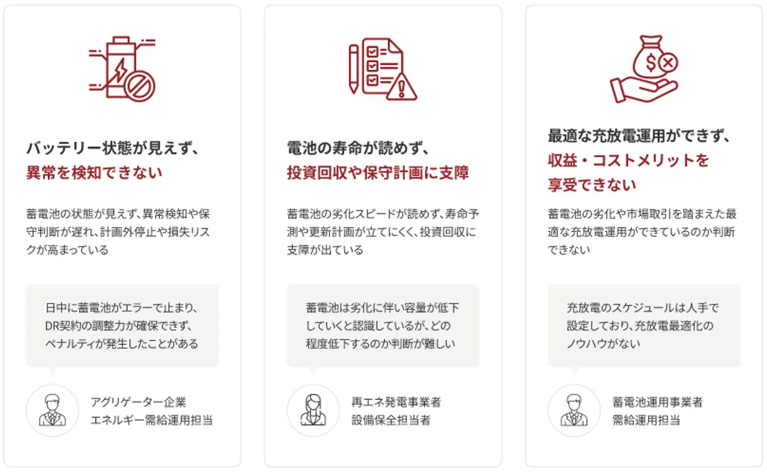 ・課題:蓄電池に対する異常検知遅れ、寿命予測および最適運用の難しさ