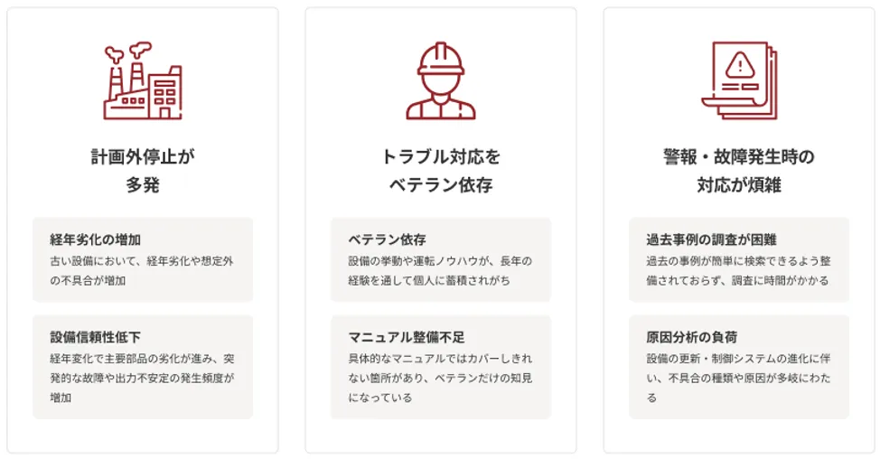 ・課題:設備の老朽化、ベテラン依存、トラブル対応の煩雑さ