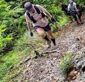 BUDOの「MINIMUM MESH SHORTS」「AIR GRID-MESH SHORTS」を着用してトレイルランニングを楽しむランナーたち
