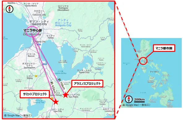 本プロジェクトは、マニラ中心部から南へ約70kmのラグナ州アラミノスに位置しており、高速道路を利用すると約75分でマニラ中心部へアクセスできる通勤圏内となっています。周辺には大型商業施設や病院、教育施設が立地しており、生活利便性の高いエリアです。