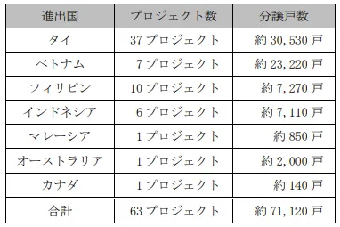 当社では現在ASEAN諸国を中心に海外における不動産事業を強化すべく、さまざまな取組を進めています。そのうち住宅分譲事業は、これらのプロジェクトへの参画により総計63プロジェクト(約71,120戸)となります。