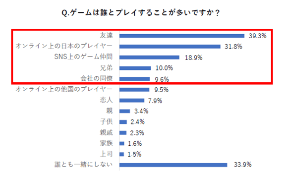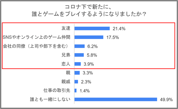 「コロナ下で新たに、誰とゲームをプレイするようになりましたか?」と質問をしたところ、「友達(21.4%)」が最多、次いで「SNSやオンライン上のゲーム仲間(17.5%)」という結果となった。