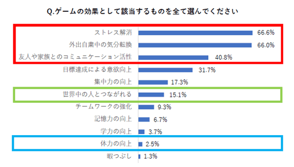 今回調査でもゲームの効果ベスト3は前回同様「ストレス解消」「外出自粛中の気分転換」「友人・家族とのコミュニケーション活性」で、ゲームプレイ時間は5割が増加しており、前回の6割の増加までいかないまでも増加傾向でした。