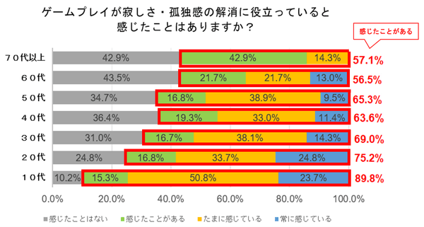 【第2回コロナ禍におけるゲームプレイ実態調査】ゲームプレイが孤独対策に役立っていると7割が回答、10代が9割・20代が8割と若い世代で顕著