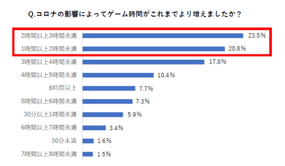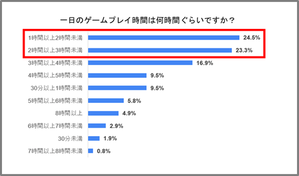 次に一日あたりのゲームプレイ時間について質問したところ、「1時間以上2時間未満(24.5%)」が最多で「2時間以上3時間未満(23.3%)」が続く結果となった。