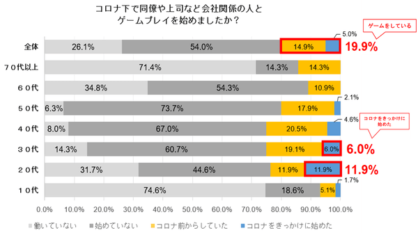 「コロナ下で同僚や上司など会社関係の人とゲームプレイを始めましたか?」と質問したところ、